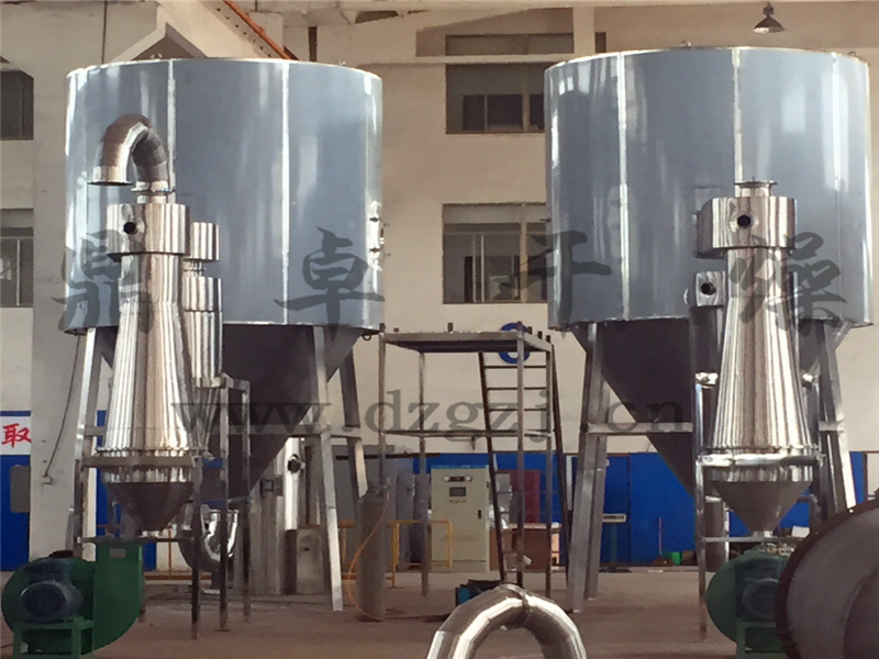 空氣經(jīng)過濾和加熱,進(jìn)入干燥器頂部空氣分配器,熱空氣呈螺旋狀均勻地進(jìn)入干燥室。料液經(jīng)塔體頂部的高速離心霧化器,(旋轉(zhuǎn))噴霧成極細(xì)微的霧狀液珠,與熱空氣并流接觸在極短的時間內(nèi)可干燥為成品。成品連續(xù)地由干燥塔底部和旋風(fēng)分離器中輸出,廢氣由風(fēng)機(jī)排空。