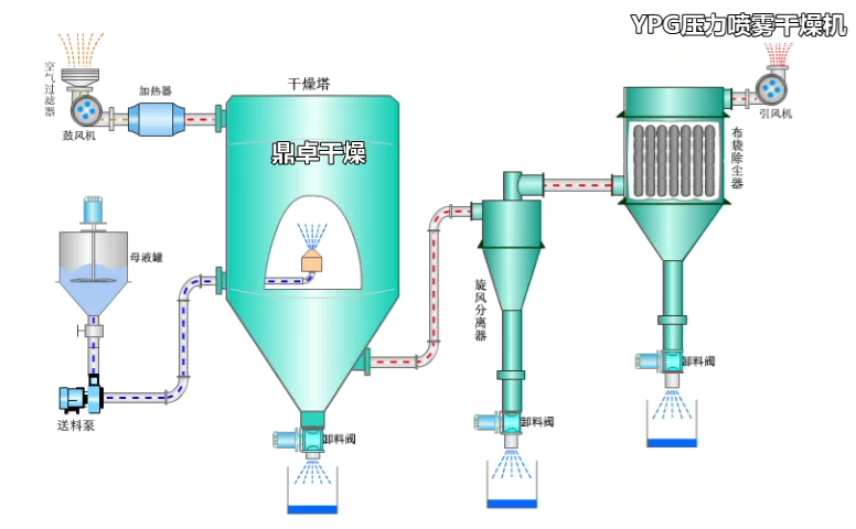 本機組工作過程為料液通過隔膜泵高壓輸入,噴出霧狀液滴,然后同熱空氣并流下降,大部分粉粒由塔底排料口收集,廢氣及其微小粉末經(jīng)旋風(fēng)分離器分離,廢氣由抽風(fēng)機排出,粉末由設(shè)在旋風(fēng)分離器下端的授粉筒收集,風(fēng)機出口還可裝備二級除塵裝置,回收率在96-98%以上。