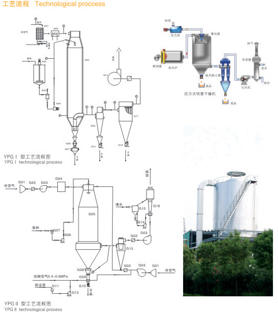 YPG系列壓力式噴霧(冷卻)干燥機是采用壓力式霧化器借助隔膜泵的壓力將溶液或漿狀的物料霧化成細(xì)微液滴,使表面積顯著增大,經(jīng)與熱風(fēng)進(jìn)行充分熱交換得以快速干燥(十幾秒至幾十秒),從而得到粉體或細(xì)小顆粒產(chǎn)品的設(shè)備。
