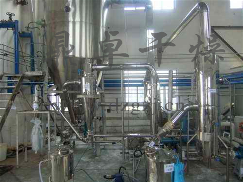 系統(tǒng)開機前通過供氮系統(tǒng)先將干燥機系統(tǒng)內的氧氣排出,當系統(tǒng)內含氧量<5%時,關閉排氣閥,打開系統(tǒng)循環(huán)閥,啟動自動補氮系統(tǒng)和泄壓系統(tǒng),啟動風機,啟動加熱,啟動冷凝系統(tǒng),當系統(tǒng)內溫度達到設定溫度后,啟動加料系統(tǒng),啟動霧化系統(tǒng),物料通過霧化器進入干燥主塔內,被霧化的料液在主塔內溶劑迅速被氣化,霧化被干燥,干燥后的物料通過主塔底部的出風管進入旋風分離被收集,少量帶有粉塵的尾氣進入冷凝洗滌回收裝置,溶劑和粉塵在回收裝置內被回收并收集回用,經(jīng)過冷凝除濕后的氮氣在風機的作用下再次回到加熱器內進行加熱并進入主塔,此過程循環(huán)進行,將進入主塔內的料液不斷被干燥。