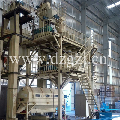 原料經定量加料器均勻送入喂料斗, 壓實機利用帶有穴眼孔的成對軋輥,彼此留有一定間隙,兩者以相同的轉速作反向旋轉。其中一組軋輥軸承座在機架內不動,而另一組軋輥軸承座則在機架導軌上游動,藉助液壓缸施壓使彼此緊靠。軋輥表面上有規(guī)則地排列許多形狀、大小相同的穴眼孔,且波谷對準波谷。而此時干粉狀物料從兩軋輥上方連續(xù)均勻地靠自重及強制喂料進入兩軋輥之間,物料先作自由流動,進入咬入區(qū)后被軋輥逐漸咬入波谷。隨著軋輥的連續(xù)旋轉,物料占有的空間逐漸減少而被逐步壓縮,并達到成型壓力大值。隨后則壓力逐漸降低,所壓得之型塊因彈性回復加之自重而脫落穴眼孔而進入碎整粒、篩分裝置,所得成品為粒狀合格產品,進行過秤包裝。而粉料口出來的細粉料和不合格的超大顆粒則由返料絞龍重新進入提升機加料口隨同新鮮物料混合加入預加料斗而進入下一輪工藝流程。