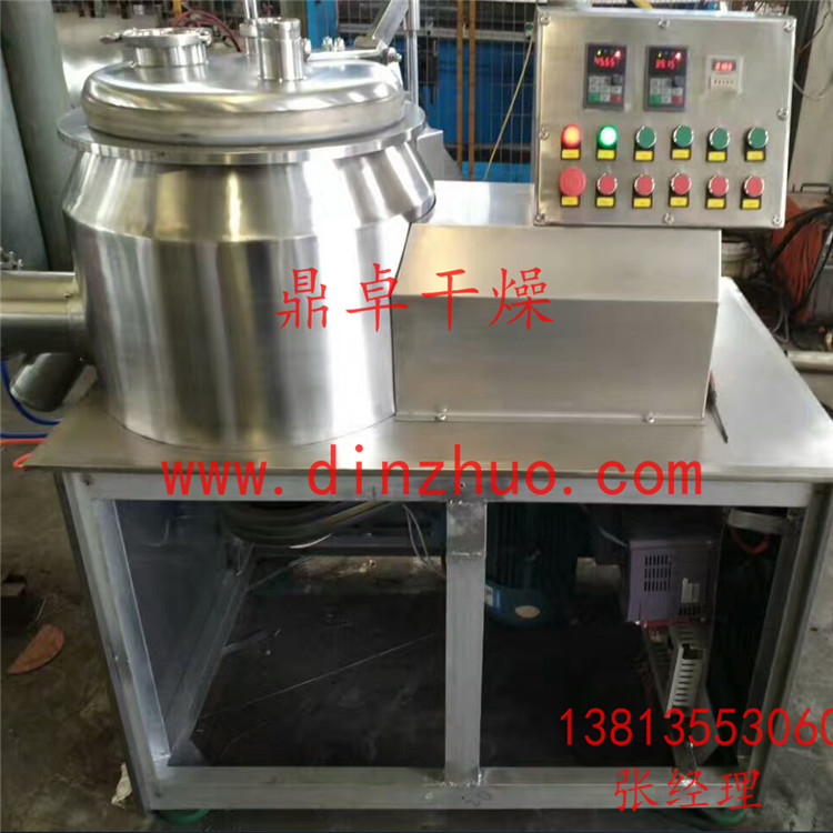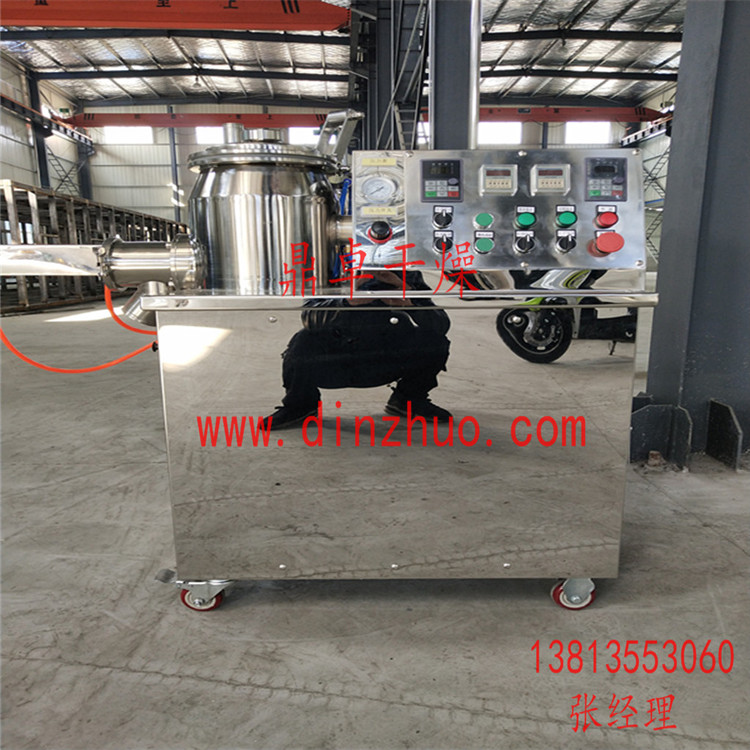 粉粒物料與粘合劑在圓筒形容器中由底部混合槳充分混合成濕潤軟材,然后由側(cè)置的高速粉碎槳切割成均勻的濕顆粒。設(shè)備密封由壓縮空氣驅(qū)動氣缸,保證了物料在混合時不會出現(xiàn)跑料的現(xiàn)象。當制粒完成后,打開側(cè)方出料氣缸,打開低速混合開關(guān),小顆粒在離心力的作用下依次排出筒體。整個過程操作簡單,出料迅速。
