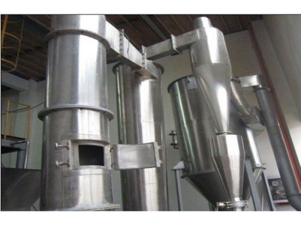 熱空氣由入口管以適宜的噴動速度從干燥機底部進入攪拌粉碎干燥室,對物料產生強烈的剪切、吹浮、旋轉作用,于是物料受到離心、剪切、碰撞、摩擦而被微粒化,強化了傳質傳熱。在干燥機底部,較大較濕的顆粒團在攪拌器的作用下被機械破碎,濕含量較低、顆粒度較小的顆粒被旋轉氣流夾帶上升,在上升過程中進一步干燥。由于氣固兩相作旋轉流動。固相慣性大于氣相,固氣兩相間的相對速度較大,強化兩相間的傳質傳熱.所以該機生產強度高。